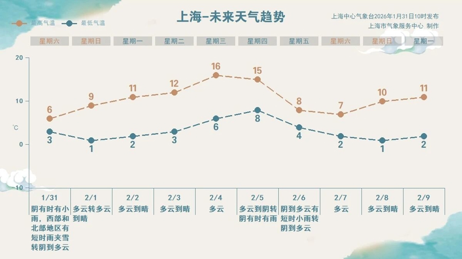 在持续了一天的阴雨和低迷气温后,申城湿冷的天气格局即将被打破。今天(1月31日)全市细雨蒙蒙,体感“阴司呱嗒”,西部和北部地区还出现了短时雨夹雪。不过,一股势头强劲的“大回暖”已蓄势待发,预计将在下周中期达到顶峰,最高气温可升至15~16℃,带来恍如春日的体感。